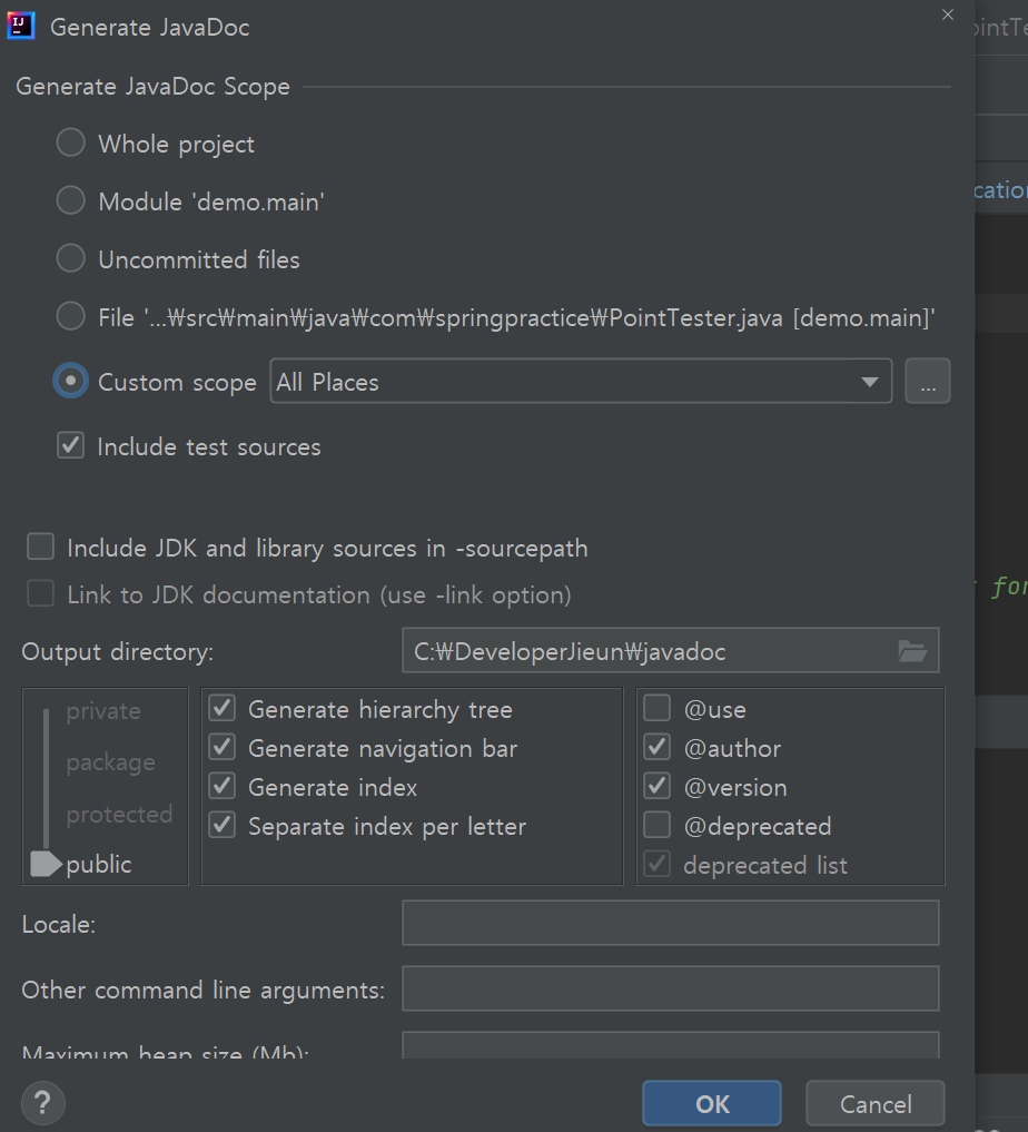 6.output directory는 javadoc을 저장할 내 로컬파일은 넣는 곳인데 이곳도 미리 만들어 놓자